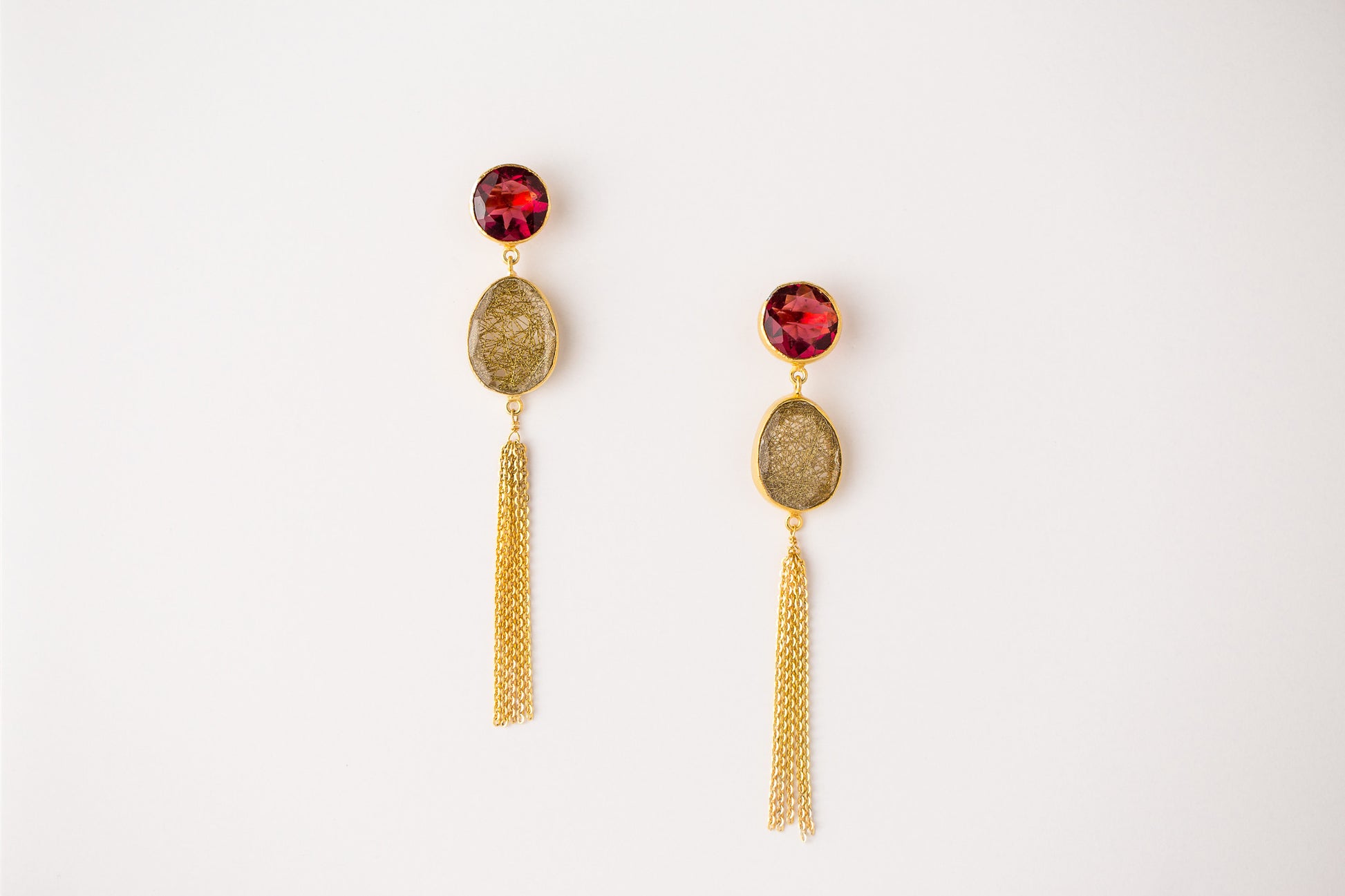 Rose hydro and rutile gemstone drops with tassled chains in gold coated metal earrings. The natural rutile fingers in the gem makes for a unique design in contrast to the ruby color.